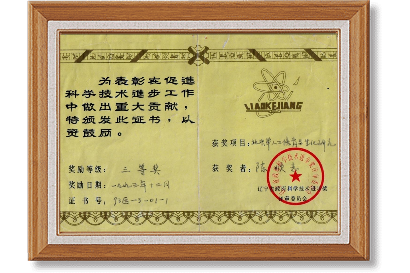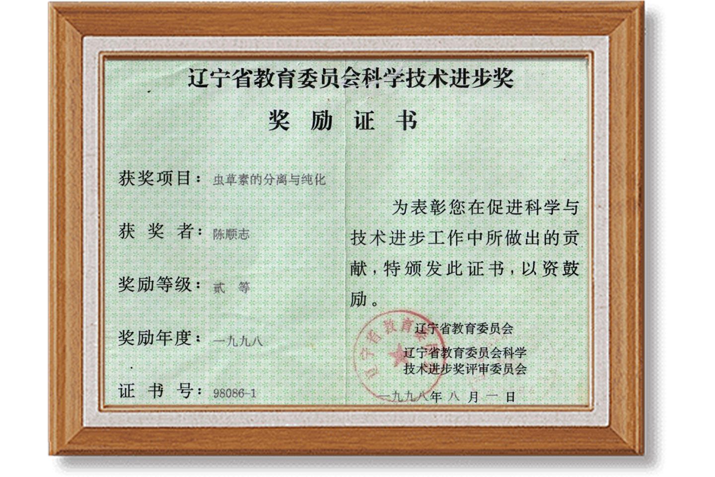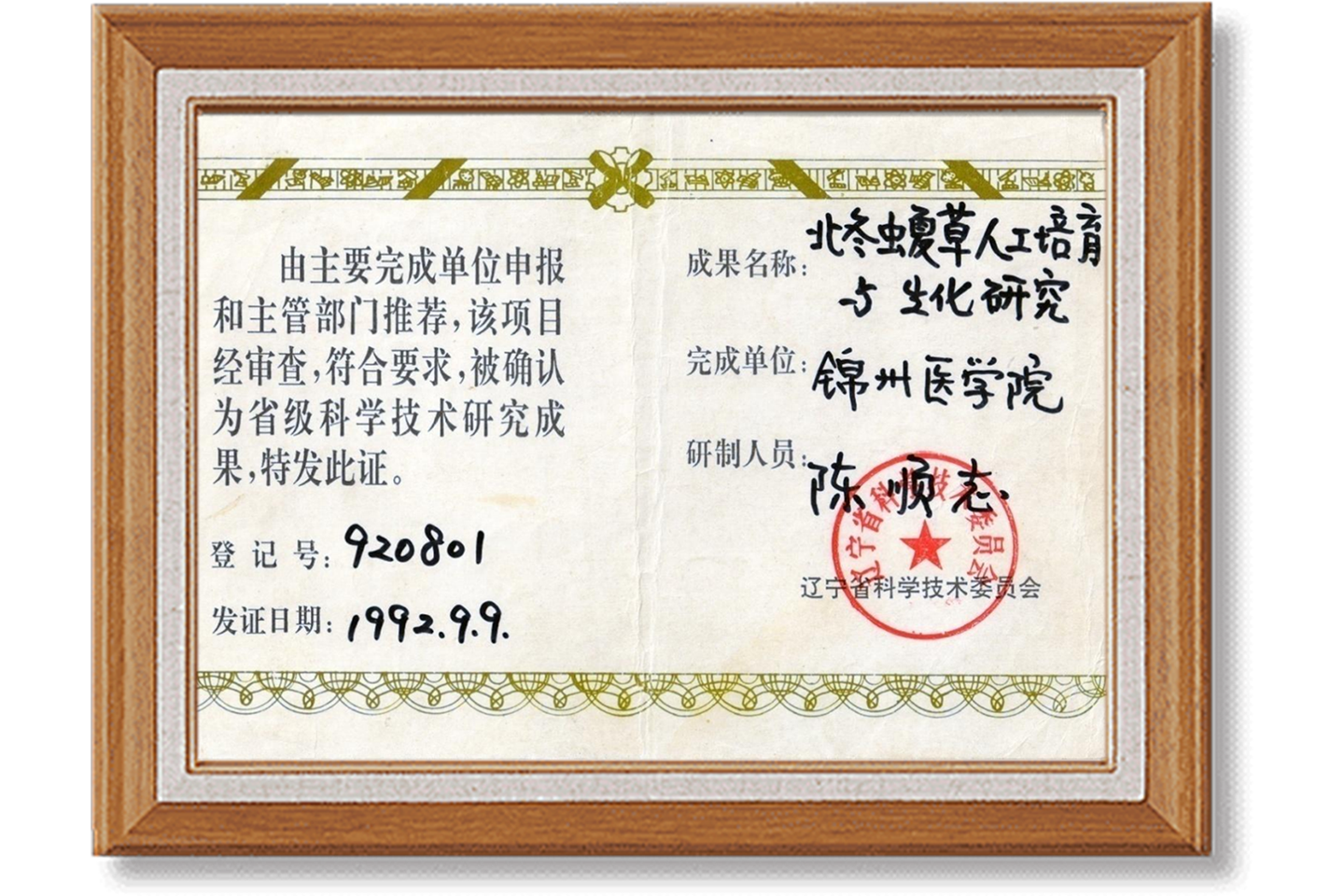 陈顺志教授研究项目“北虫草人工培养与生化研究”获辽宁省科委科技进步三等奖, 论文在《中华医学杂志》发表并举办了全国性技术学习班,推广该技术