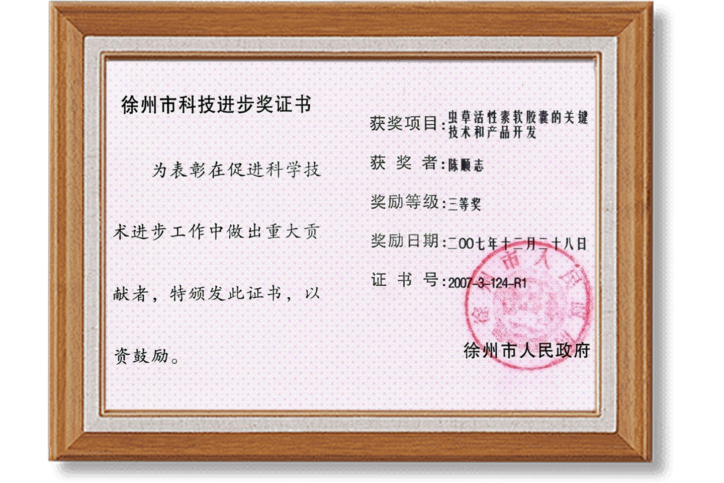 陈顺志教授研究项目“虫草活性素软胶囊的关键技术和产品开发”获得徐州市科技进步三等奖