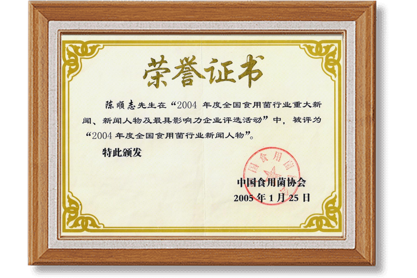 陈顺志教授被中国食用菌协会评选为“2004年度全国食用菌行业新闻人 物”