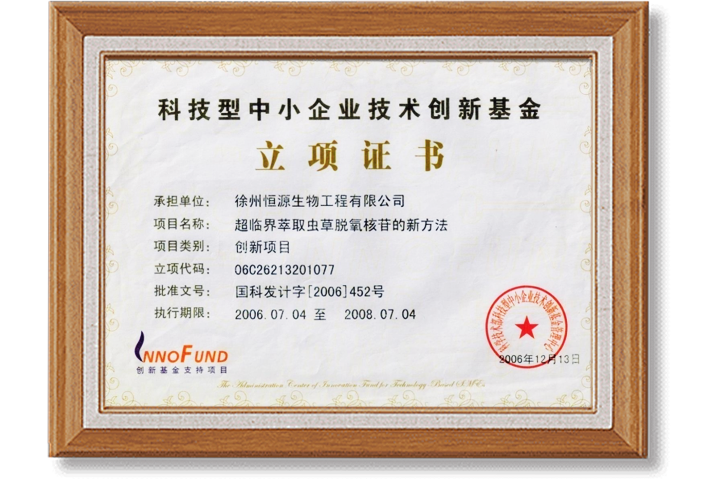 陈顺志教授研究项目“超临界萃取虫草脱氧核苷的新方法” 获得科技型中小企业技术创新基金证书