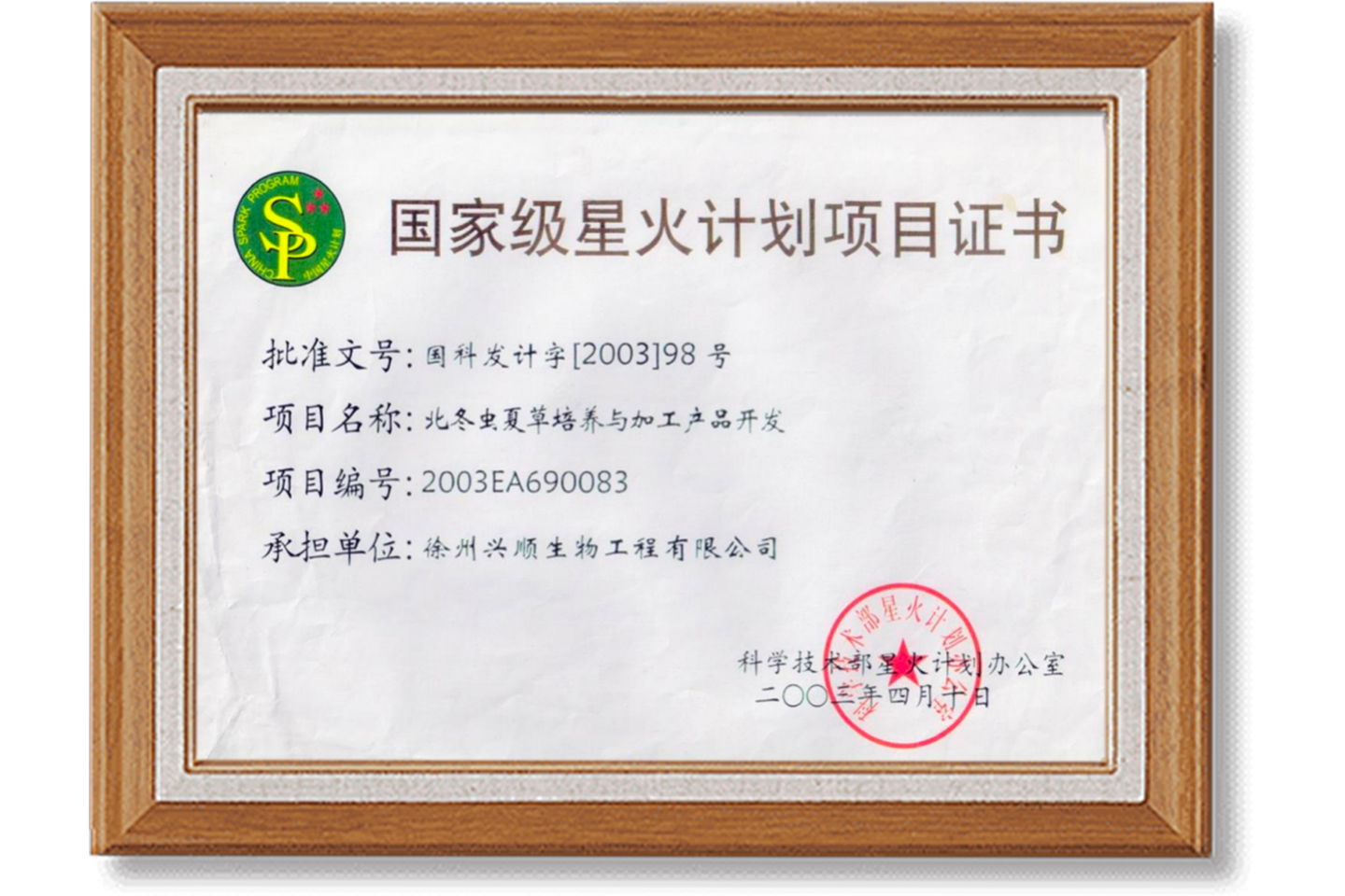 陈顺志教授研究项目“北冬虫夏草培养与加工产品开发“获得国家级星火计划项目证书