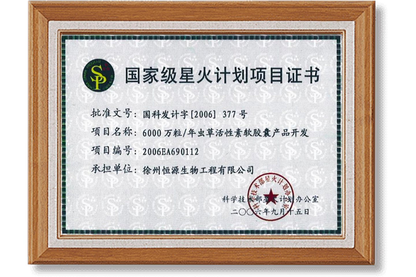 陈顺志教授研究项目“虫草活性素软胶囊规模产品开发”获得国家级星火计划项目证书