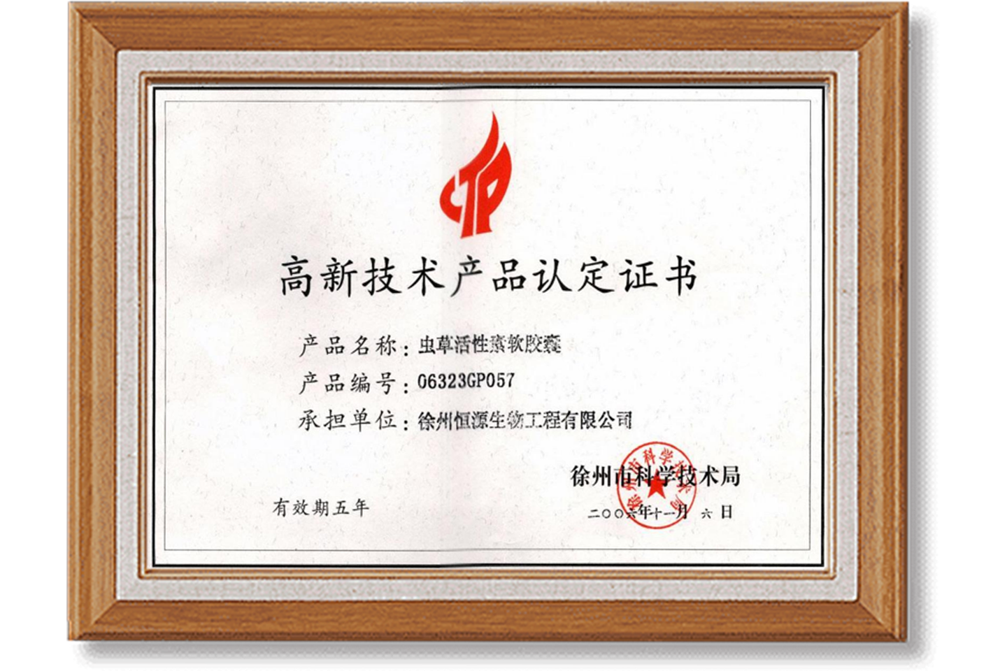 陈顺志教授研究项目“虫草活性素软胶囊”获得徐州市科学技术局高新技术产品认定证书