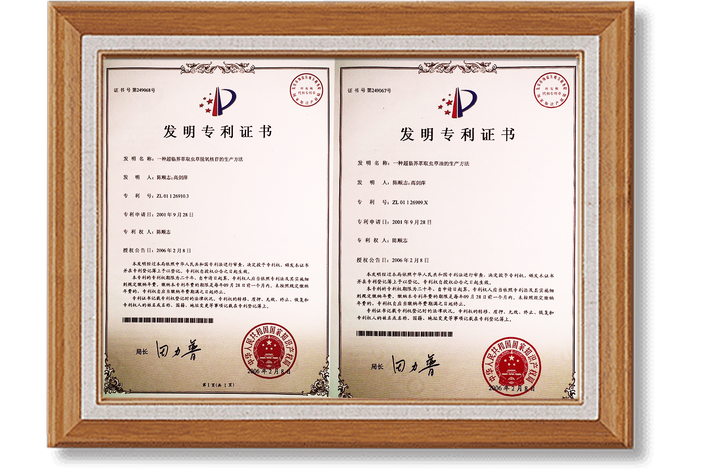 陈顺志教授研究项目获得两项发明专利证书:“一种超临界萃取虫草脱氧核苷的生产方法”、“一种超临界萃取虫草油的生产方法”