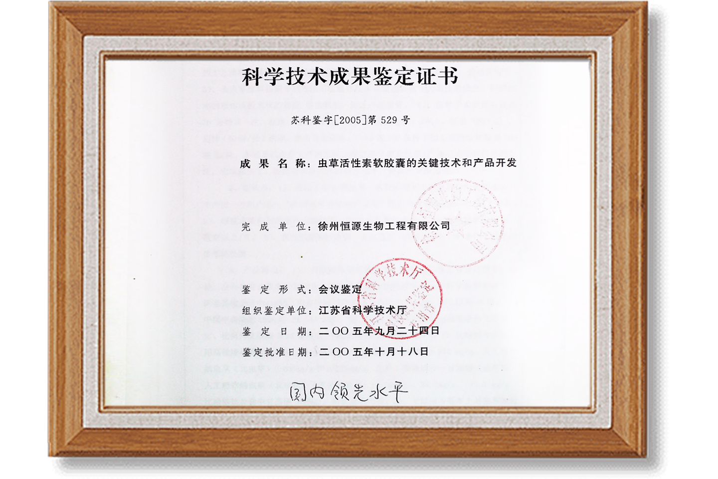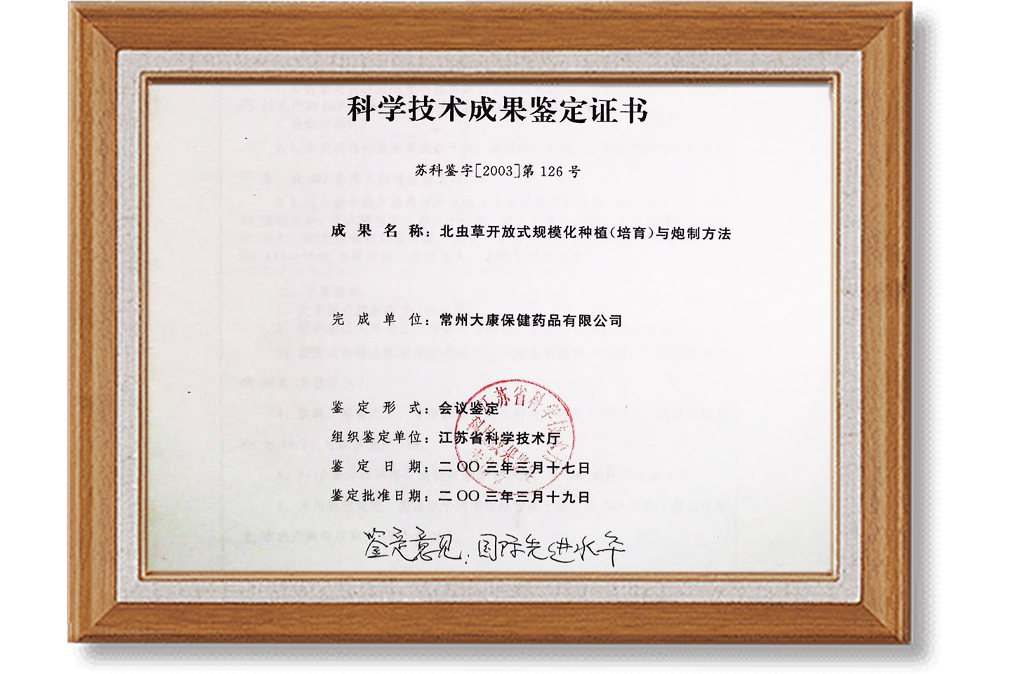 “北虫草开放式规模化种植(培育)与炮制方法”通过刘耕陶院士等专家鉴定,达到国际先进水平”,同时,此项目成果获得江苏省科学技术厅科技成果鉴定证书